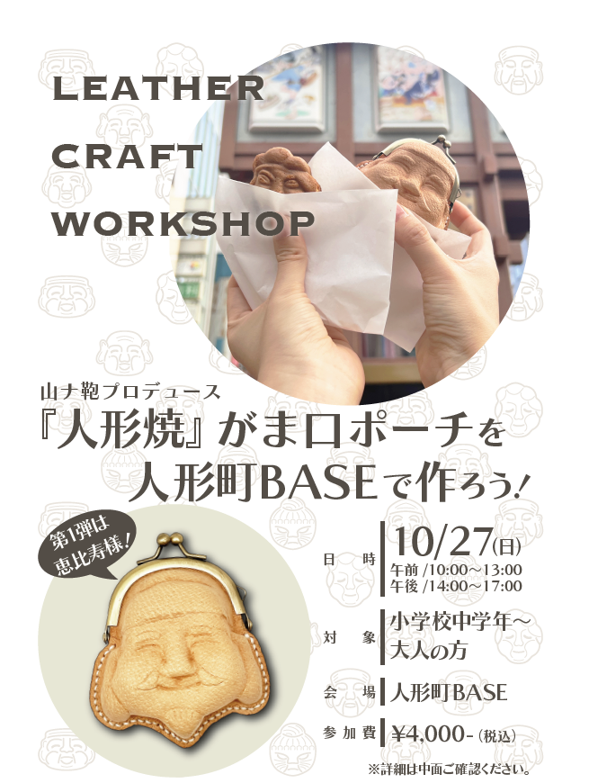 銘菓 人形焼をイメージした、「人形焼」がま口ポーチが作れるワークショップです。