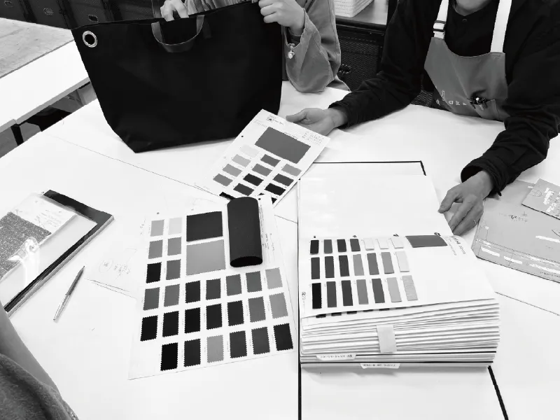 人形町BASEには、カバンや袋物、靴など様々な分野のプロが集まっています。様々な経験と知識を組み合わせ、より良い商品になるように常にベストな方法を模索し、製作しております。